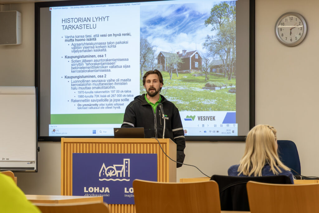 Kahvittelun jälkeen siirryttiin varsinaiseen ohjelmaan. Yhdistys oli pyytänyt paikalle Vesivekin edustajat kertomaan katto- ja salaojaremointeista sekä jäseneduista. Vesivek osallistuu myös jäsenhankintaan ja on myös Omakotiliiton yhteistyökumppani.